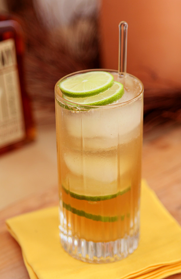 To make this drink, first crack ice and half fill a highball glass with it. Squeeze half of a lime half into this and throw it in. Next, pour 1½ oz bourbon and ½ oz Maple Grove Farms’ sugar-free low-cal maple syrup in it. Fill the rest with plain chilled water. Stir lightly and serve with lime wheels.