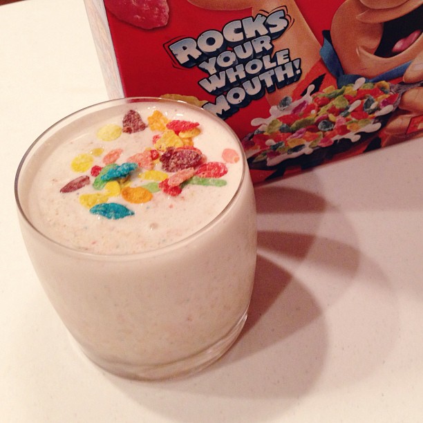 Half fill a shaker with ice cubes. Now, pour ½ oz of each of bourbon, premixed eggnog and Bailey’s Irish Cream, ½ oz of amaretto, 1 tsp of espresso coffee powder (alternately, a drop of vanilla essence, whichever flavor you prefer) and 1 oz milk, and shake for about 20 seconds. Transfer the mix into an old-fashioned glass. Garnish it with crushed nuts and 1-2 tsp of Fruity Pebbles cereal.