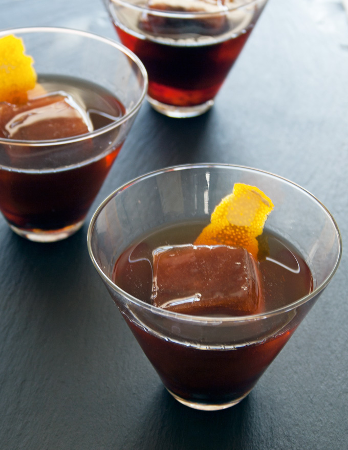 In a mixing glass, stir mix 2 oz bourbon, ½ oz of each of creme de cacao and Campari (this acts as an aperitif), and ¼ oz hazelnut liqueur. Strain into cocktail glasses and serve with a garnish of chocolate shavings.