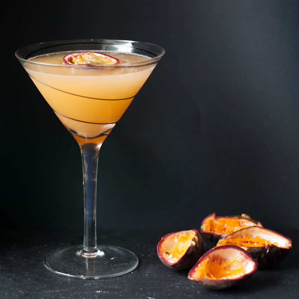 First shake together 1½ oz of cachaça, ½ oz of each of limoncello and sugar syrup, 1 oz lemon juice, and the juice of half a passion fruit, along with a handful of ice cubes. Strain into pre-chilled martini glasses. Float a slice of chilled passion fruit before you serve.