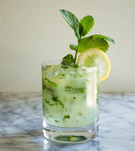 In a glass, lightly crush 5-7 mint leaves together with 2 wedges of lime using a muddler. This will release the flavor of both. Now, put a few ice cubes in it, and then add 1 oz of each of cachaça and ginger liqueur, along with ½ tsp sugar syrup and ½ oz of white rum. Fill the rest of the glass with chilled lemonade or sparkling soda. Gently stir and attach a lemon wheel to the rim. Now, stand a fresh mint sprig and serve.