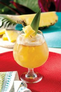 Blend together 2 oz of cachaça with 4 oz of pineapple chunks, ½ tsp of granulated sugar, and 1 cup of crushed ice for about 15 seconds or until smooth. Transfer into antique glasses and decorate with pineapple leaf and chunks before you serve.