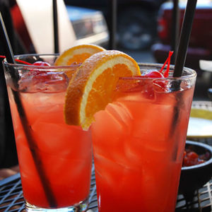 Blend Chambord Raspberry Liqueur, and Midori ½ oz each, with 2 oz orange juice, and 1 oz each of cranberry juice, pineapple juice, and Frangelico hazelnut liqueur. Pour the mix over ice in a glass. Top with cherries and orange rinds.