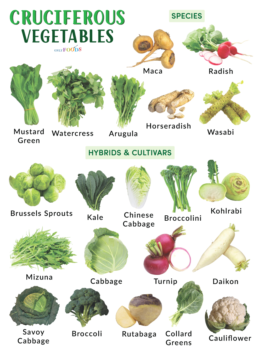 Like most other fruit and vegetable groups, the cruciferous group consists of both naturally occurring species as well as hybrids and cultivars.