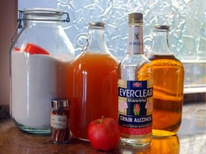 In a large pot, pour 1 gallon of apple juice and apple cider, each. To this, add 4 to 6 three-inch long cinnamon sticks, and 1½ cups of sugar. Place the pot over your gas burner and bring it to a boil over medium heat. Keep stirring until the sugar dissolves. Turn off your burner and let it cool down to room temperature. Finally, pour 1-liter Everclear, and stir mix evenly. Discard the cinnamons and refrigerate until it is chilled enough. Decorate with apple slices and serve in shot glasses.