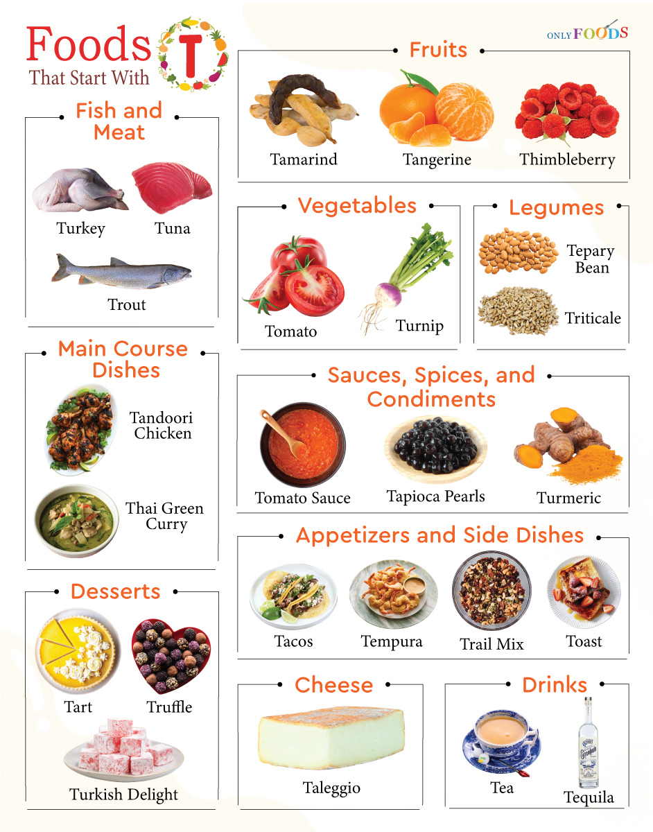 From fruits and vegetables to dairy products to appetizers and desserts, hundreds of foods worldwide have names starting with the letter ‘T.’ However, it is impossible to list all of them; over 100 of the most well-known foods with ‘T’ are mentioned below.