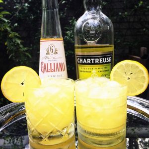 In a large mixing jar, mix yellow chartreuse, gold tequila and Galliano in equal parts, over a lot of ice cubes. Serve your guests with lemon wheels in stylish old-fashioned cocktail glasses.