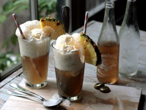 Use a muddler to roughly crush 1-2 fresh sage and mint sprigs with 1 tsp lime juice. To this, add ½ oz of each of tequila, mango nectar, and pineapple juice. Now add a pinch of cayenne and ground ginger, each, to this mix. Add ice cubes and fill the rest with Kirks dry ginger ale. Garnish with pineapple chunk, a small scoop of sour cream and a tbsp of vanilla ice cream. Tastes yummy!