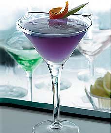 Combine 2 tsp of blue curacao with a few drops of grenadine (so that it turns somewhat violet or purple). To this, mix 1½ oz of gin. Transfer into chilled martini glass before serving.