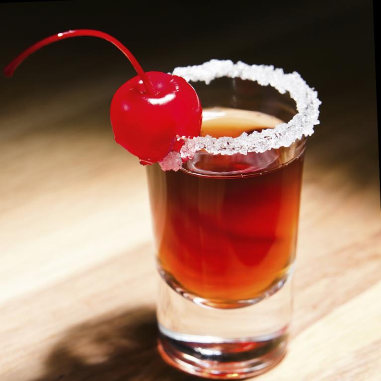 Evenly mix ¼ oz of each of grenadine, tequila, anisette and Grand Marnier in pre-chilled shot glasses rimmed with salt. Add a frozen cherry in each of the glasses and shoot in.