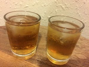 Throw ice cubes into drinking glasses. Over these, pour 1 oz of Maker’s Mark bourbon whiskey along with a dash of grenadine and honey (or maple syrup) each. Fill the rest with ginger ale. Do not stir, since the fizz from the ale will slowly mix them all by itself.