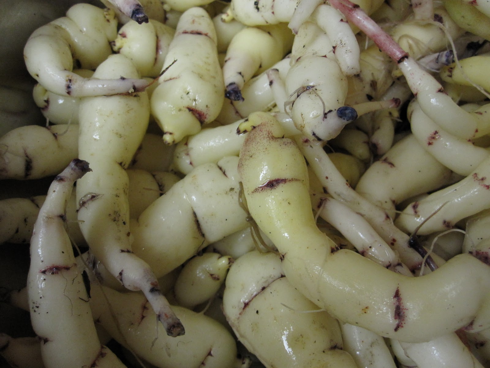 Roots: The tubers or rhizomes are usually pale white or yellow sometimes striped with purple or red. Some varieties may have red or purple roots.