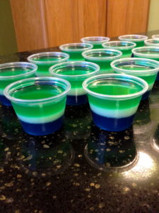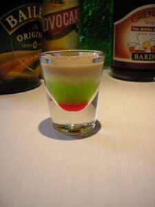 This will give you three layers in red, cream and green. However, you might want to replace Advocaat with something more colorful like the cyan-colored Hpnotiq.
