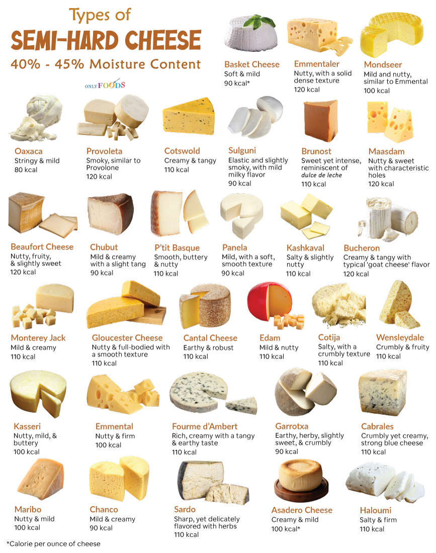 | Emmental | Cow | Nutty amd firm | Switzerland | ~110 kcal | Fondue, sandwiches, and gratins |