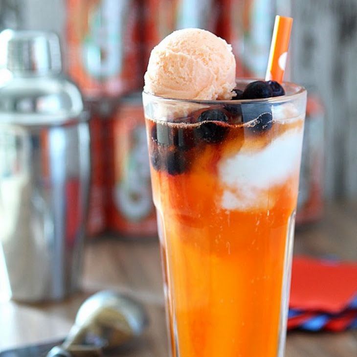 To make it, take a pre-chilled 8-oz glass. Pour 1 oz of St-Germain liqueur and Hendrick’s Gin, each, and ½ oz juice of a fresh orange in it. Add 3 oz of ice-cold sparkling water and give a mild stir. Now, carefully float a large scoop of vanilla/chocolate ice cream and spread a few frozen blackcurrant fruits over it. Sip immediately.