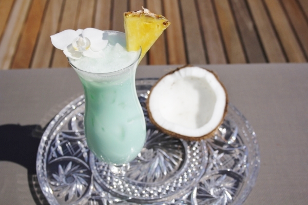 This fruity cocktail is an ideal pool or beach drink. Pour ¾ oz of each of coconut milk and vodka, ¼ oz of sweetened cream (or else, smoothly-whipped yogurt, if you want it sour) and blue curacao, each, along with 1½ oz of white rum and 2 oz of pineapple juice (or, ginger ale), in a pre-chilled jug or a large mason jar. Use a mixing spoon to combine. Now serve in cocktail glasses. You can tuck a cocktail umbrella and/or a chunk of pineapple on top.