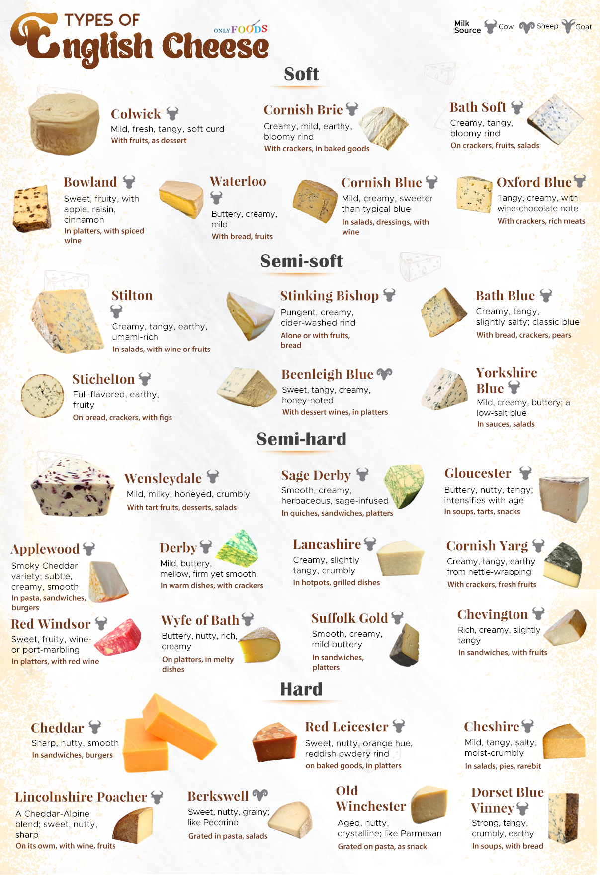 | Cheshire | Hard | Cow | Cheshire | Popular | Mild yet tangy and salty with a crumbly but moist texture | In salads, pies, and regional dishes like Cheshire Rarebit |