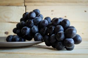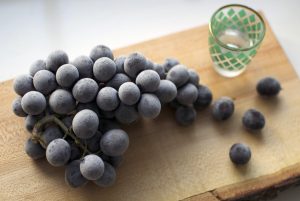 Kyoho, originating in Japan, is a grape as big as the size of a plum. Its development dates back to the 1930s by crossing the Centennial and Ishiharawase varieties. They are large, and blackish-purple, also having big, bitter-tasting inedible seeds. Their skin, though not eaten traditionally, can be separated from the fruit. The juicy flesh is mildly acidic with a sugary taste.