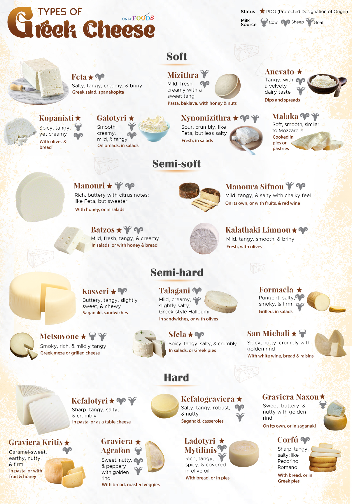 | Touloumotyri | Aegean | Sheep Goat | Tangy, and slightly spicy with a little salt, gets its name from being aged in a “touloum” (goat skin bag) | Served with olives, as part of mezze platter, or grilled |