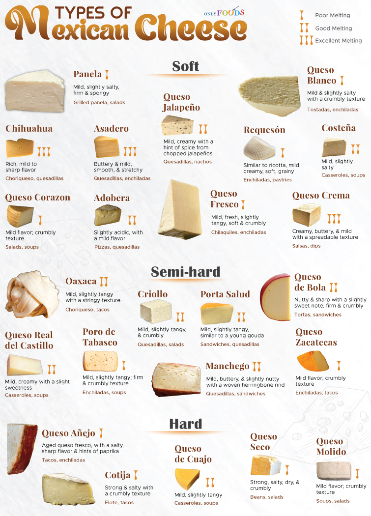 | Adobera | Jalisco | Cow | 90 kcal/oz | Slightly acidic, with a mild flavor; melts well. | Mexican-style pizzas, quesadillas, baked casseroles, soups. |