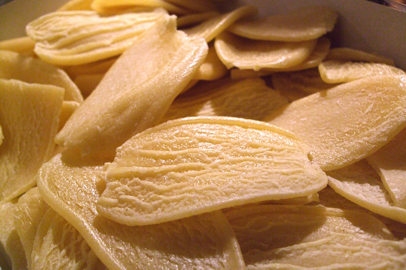 Oval in shape, they look like petals or pearls, also having a slight curvature at the center. It is irregularly shaped, with one side being rough than the other, helping the sauce to cling onto it better. Besides being baked, they are served in soups.