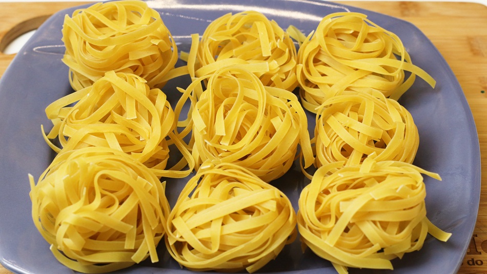 Flat and ribbon-like, fettuccine has a thick appearance, traditionally prepared with flour and eggs. It is almost similar to tagliatelle, except for being narrower than the latter. Spinach fettuccine, a variation, has spinach as the additional ingredient alongside eggs and flour. Fettuccine Alfredo, also comprising of Parmesan cheese and butter, is one of the popular dishes made with this pasta.