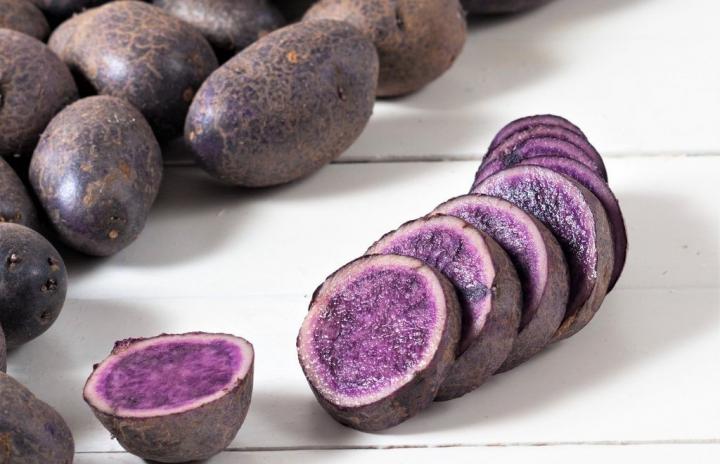 The Purple Majesty, known for its rich flavor and blue skin, is a medium-sized all-purpose potato variety that has plenty of antioxidants. It is an ideal choice for making chips because it retains its moisture and firmness after cooking.