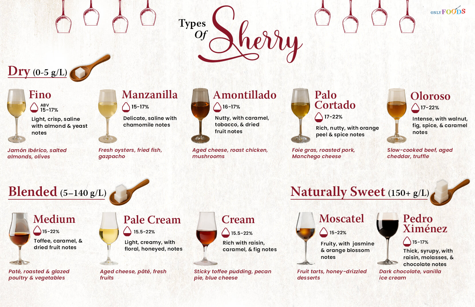 Here are all the main types of sherries, with their flavor profiles, and a few food pairing ideas: