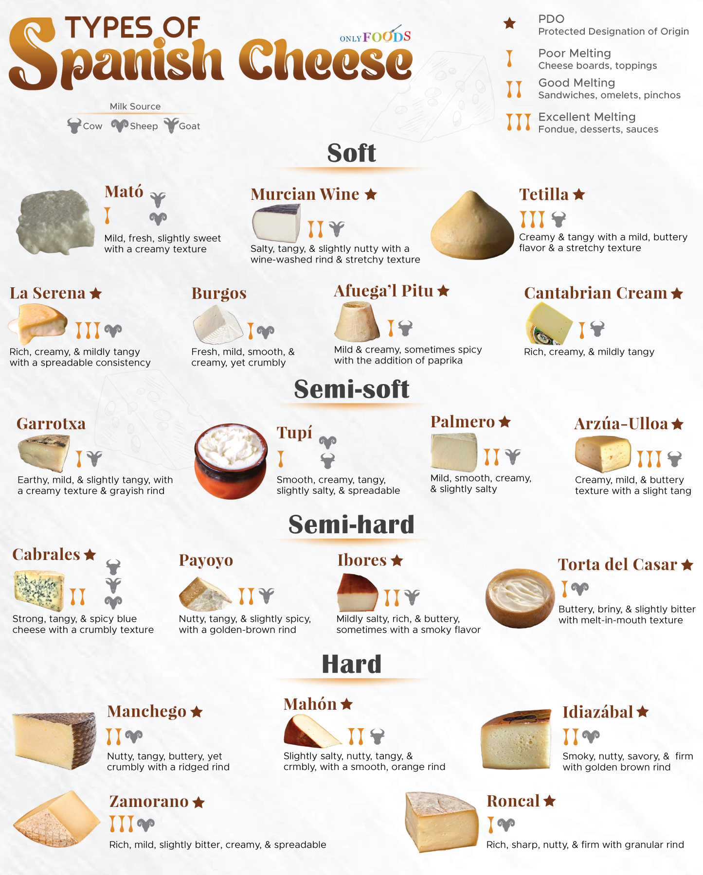 | Zamorano* | Hard | Sheep | Castile and León | Popular | Rich, creamy, mild, and spreadable with a slightly bitter taste; excellent melting. | Fondou, sauces, sandwiches, casseroles. |