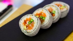 Ingredients: Sushi rice, filling contains tuna, crab meat, mayonnaise, cucumber, avocado, or carrots, and an optional coating made with cooked sesame seeds or roe