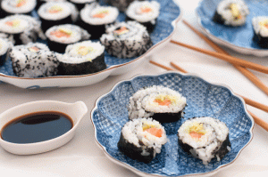 Ingredients: Sushi rice, fish such as tuna, salmon, or smelt, served with soy sauce, wasabi, rice wine vinegar, or sesame oil; veggies like seaweed, cucumber, pickled daikon radish, or avocado