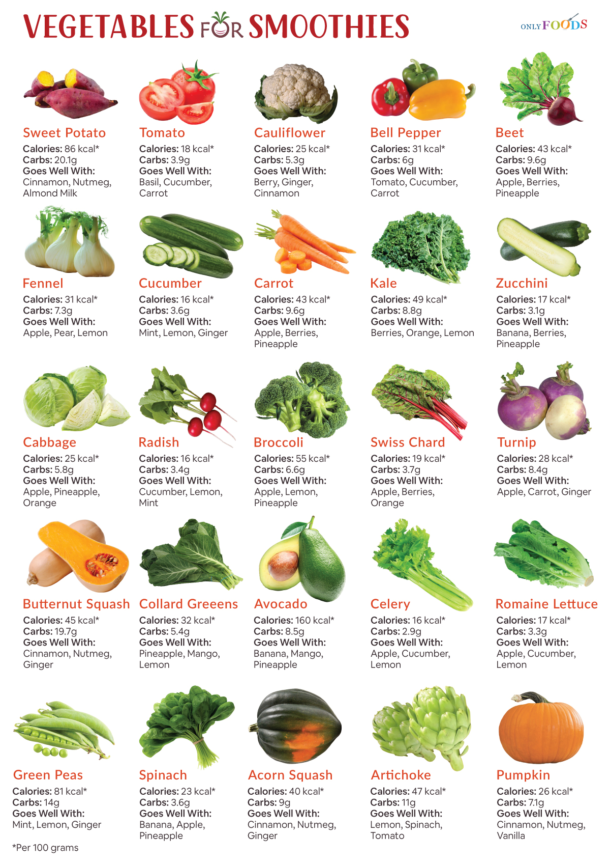 | Beet | 9.6g | 43 kcal | Earthy, sweet | Apple, Berries, Pineapple |