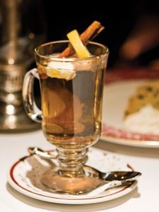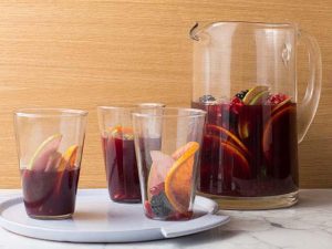 In a big punch bowl, mix 4 cups of red wine (or English ginger wine, if you prefer it gingery), with 1¼ cups of each of triple sec, kirsch cherry brandy, St. Germain Elderflower Liqueur, and gin. Throw in sliced oranges, pears, and apples in the mixture and stir evenly. Now, serve with a hot snack like fried spaghetti, or hot pizzas.